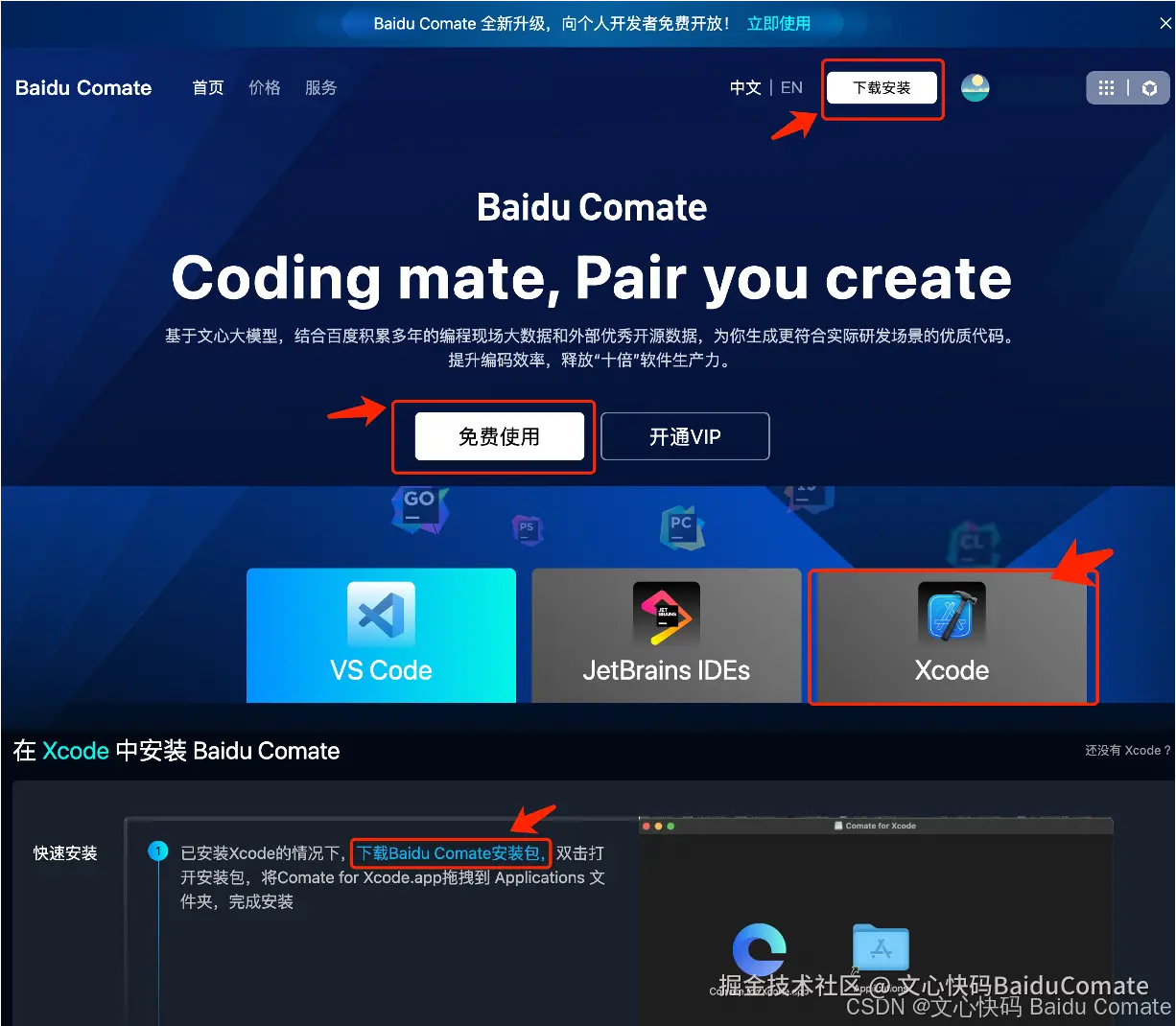 Step1 电脑端进入 文心快码 Baidu Comate 官网,「免费使用」/「下载安装」,下载 Comate for Xcode 安装包