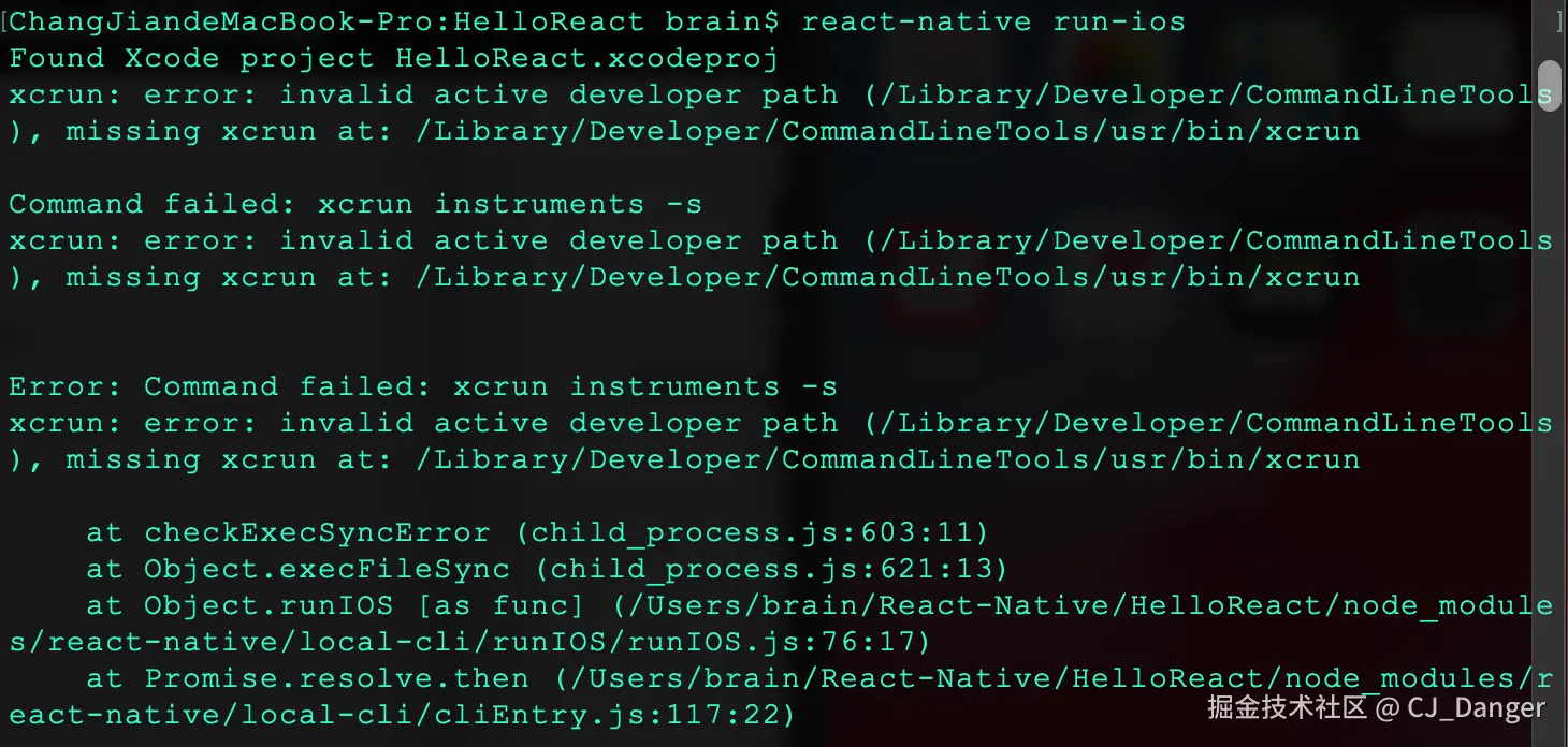 这个错误意思是xcode没有配置命令行工具,所以打开Xcode,左上角选择Preferences,然后选择Locations,找到Command Line Tools,选择命令行工具即可.