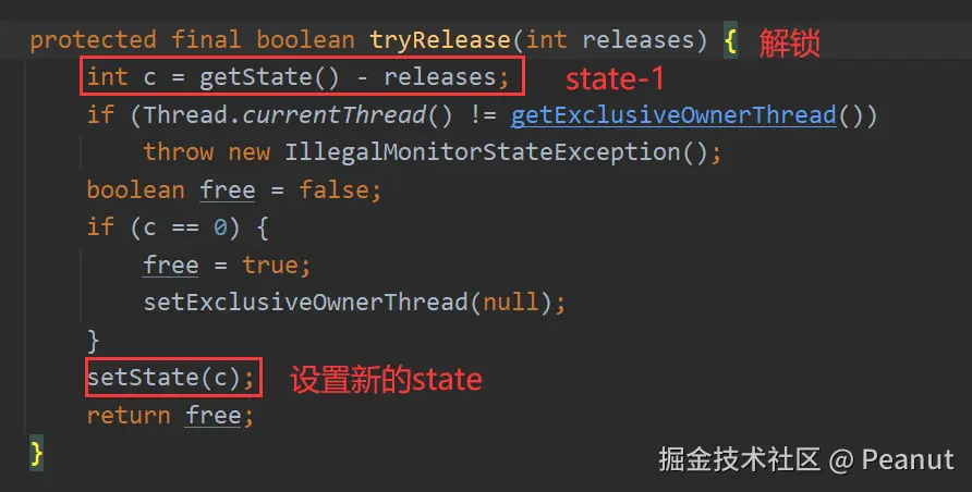 - 非公平原理。当持有锁的释放锁时,调用tryRelease,设置