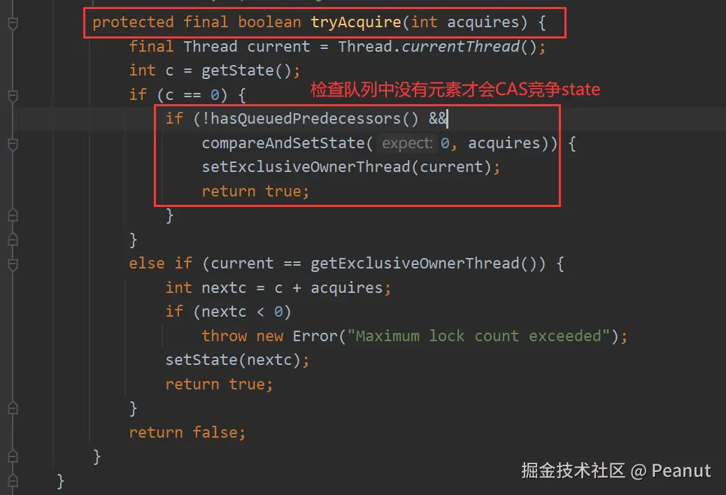 exclusiveOwnerThread,所以是非公平的。 - 也就是说,非公平锁尝试加锁时,直接CAS对state进行操作,不会检查等待队列中是否有元素。 (有点像插队的感觉)