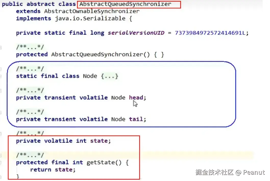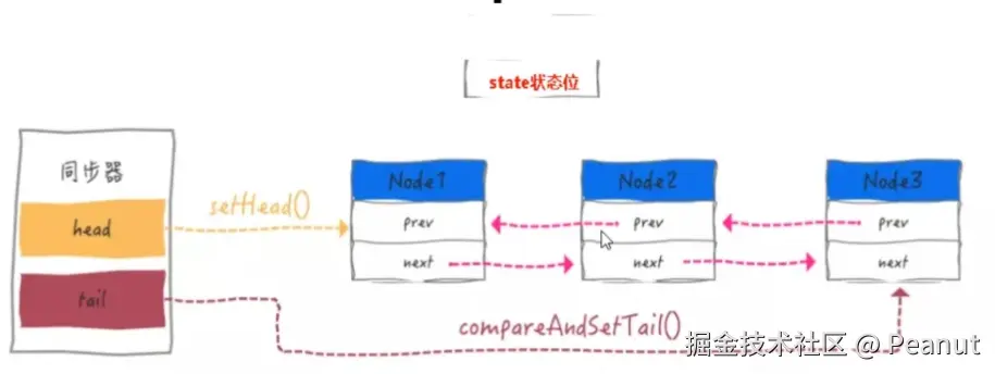 (AQS其实只存了head节点和tail节点的引用,和一个int的state变量表示同步状态)