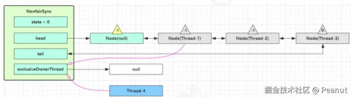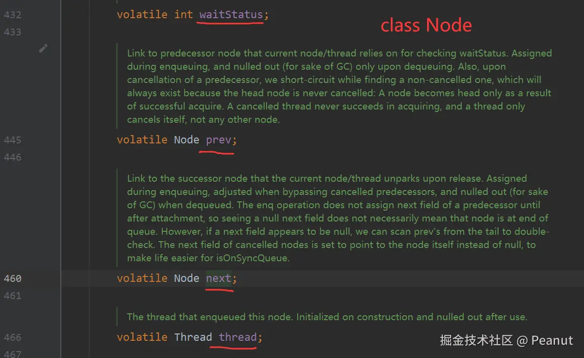 每个Node节点表示一个请求线程,存了thread(线程)、waitStatus(当前节点的等待状态)、prev(前节点)、next(后节点)。