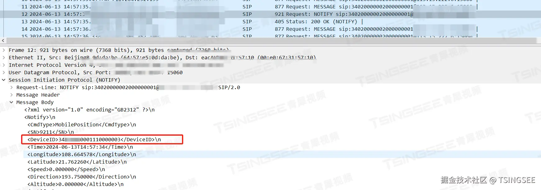 因为设备是通过国标GB28181接入,所以我们抓包分析。抓包发现设备发送了NOTIFY实时GPS信息,展开信息查看deviceid编码,发现了问题原因:deviceid写的是设备编码,并不是通道编码。