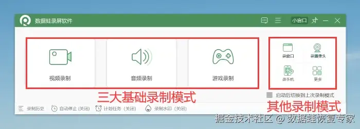 步骤1:在您需要进行录屏的电脑上下载并安装好数 据 蛙录屏软件。进入软件的主页面,可根据录制需求选择不同的录制模式。在此,将以常用的 【视频录制】 模式进行演示。