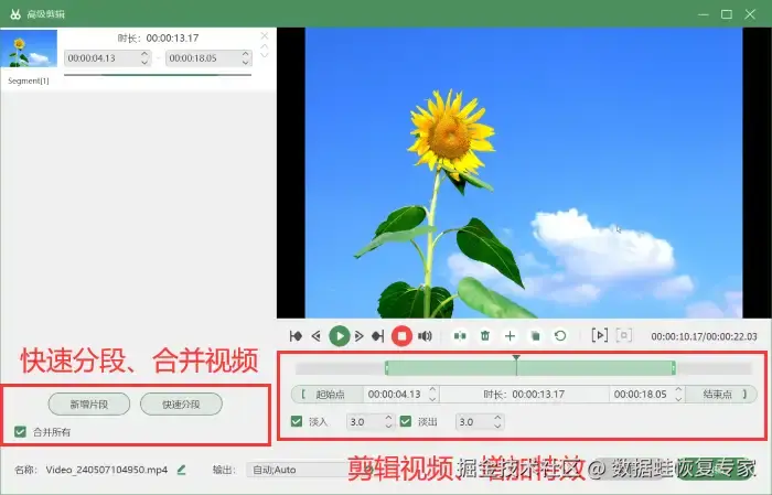 步骤3:录制完成的视频,可以直接通过预览视频进行保存,也可以点击进入 【高级剪辑】 页面对视频进行快速分段、剪辑、增加特效等处理。编辑完成后点击 【剪辑】 保存视频并结束这次录屏。