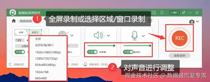 步骤3:在 【视频录制】 界面,可以选择全屏录制或区域/窗口录制,还能设置排除窗口。对摄像头、声音等进行调整后,点击录制按钮 【REC】 进行电脑录屏。