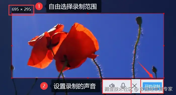 步骤2:选择录制范围、设置声音,点击 【开始录制】 进入录屏。
