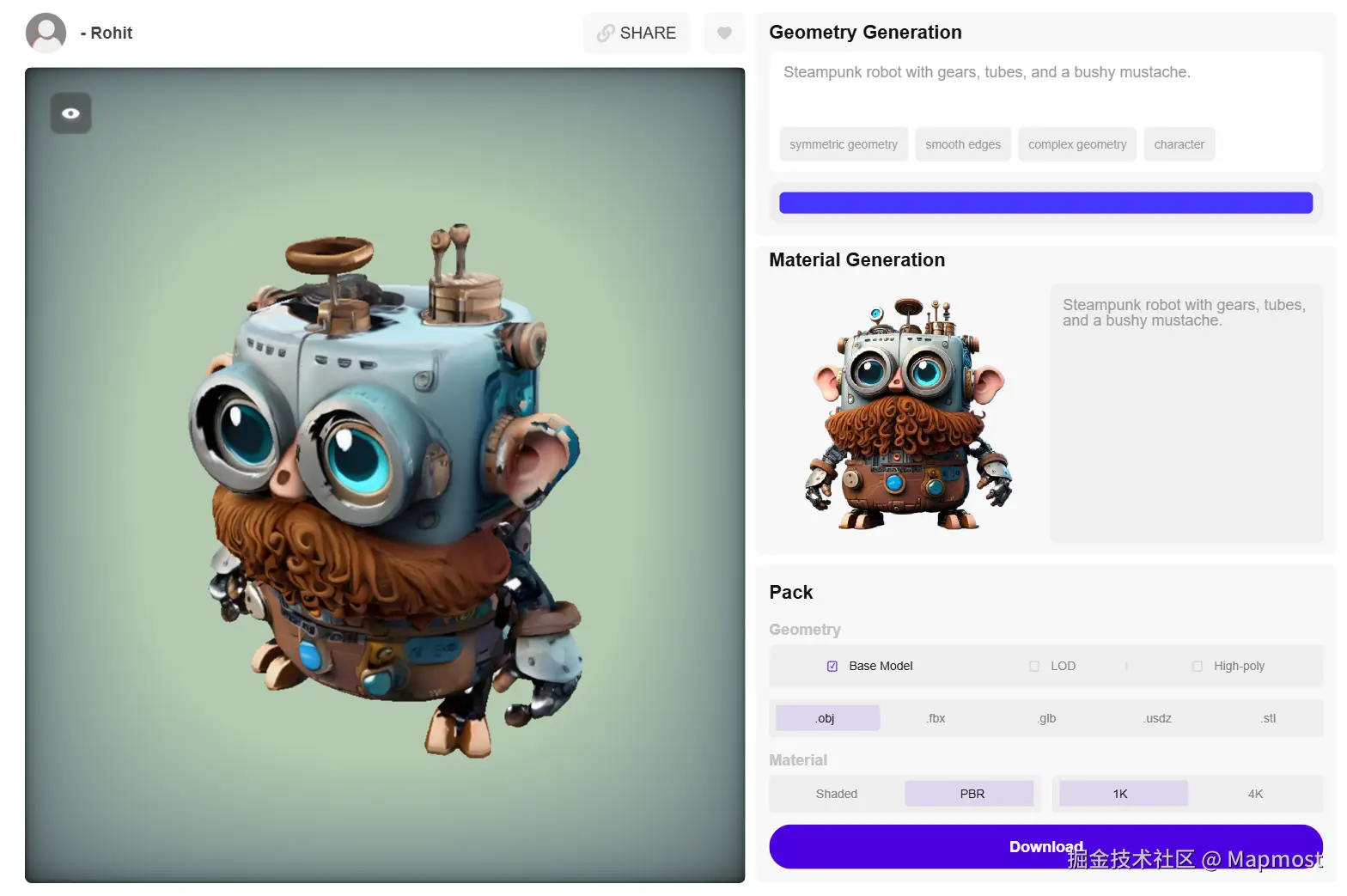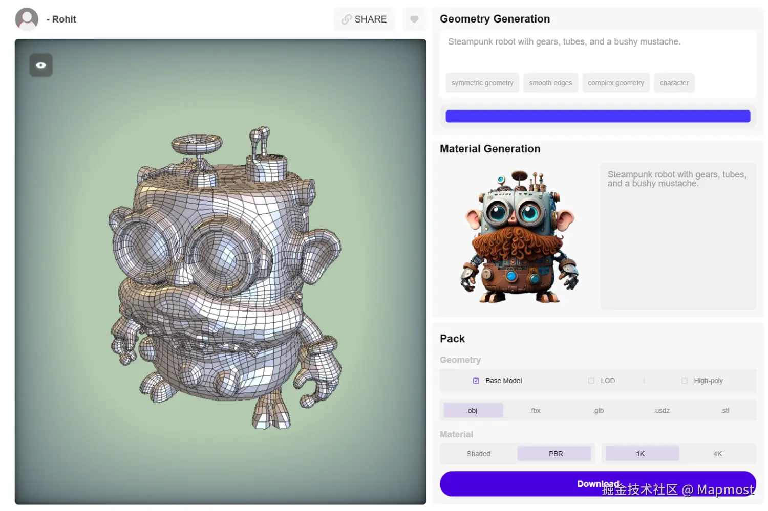 上面的小机器人正是由几个提示词生成,而且布线工整,面数可以自由调节,甚至可以自动生成Lod,PBR材质。