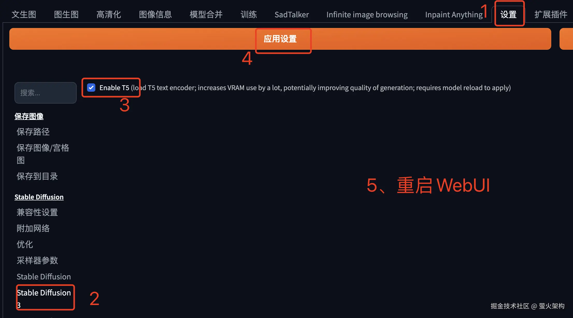 另外SD3引入了新的文本编码器,出图效果更好,但是占用的显存也很可观,所以默认没有开启。显存不差钱的同学可以在设置中打开,操作步骤如下图所示。