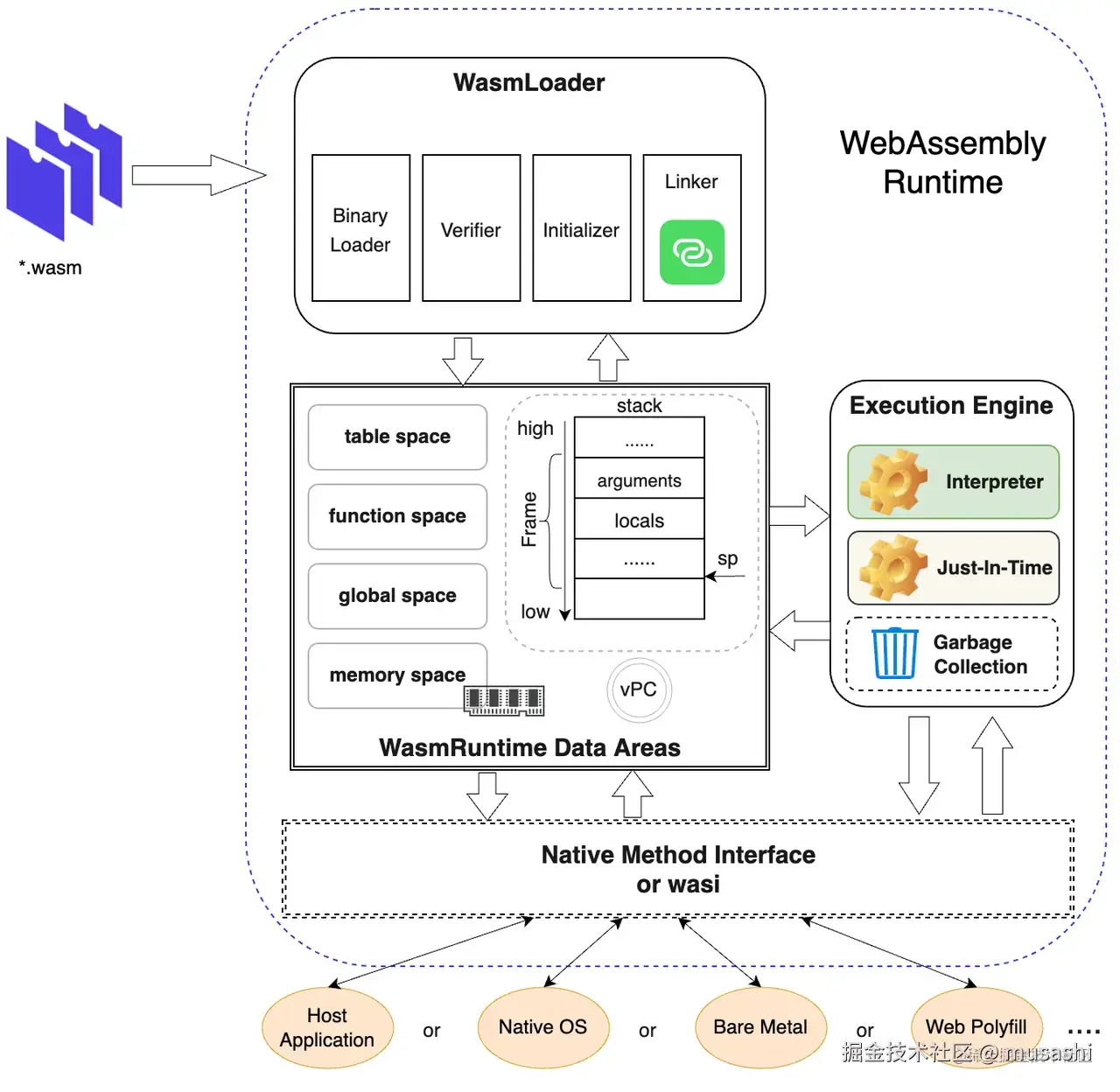 WebAssembly 运行时由模块加载和解析器、执行引擎以及与宿主的系统交互接口(WASI,浏览器环境) 等关键部分组成,类似于 JVM。