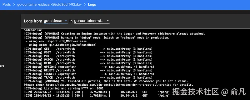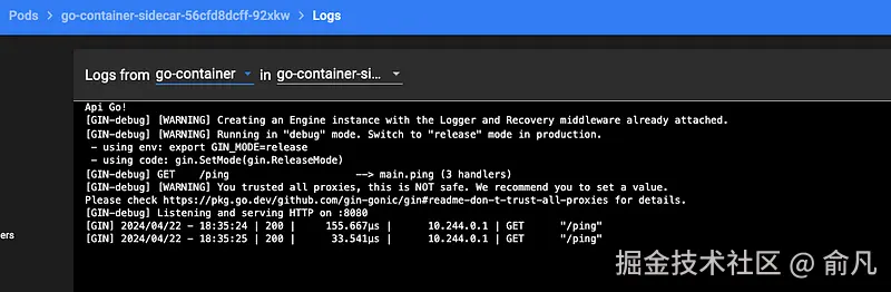 - API 返回了 JSON 消息,我们看一下容器日志。