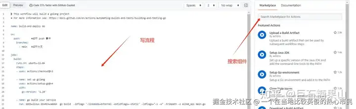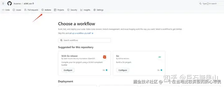 回到仓库首页,点击 action ,选择一个模板,比如我选择了 Go 这个模板