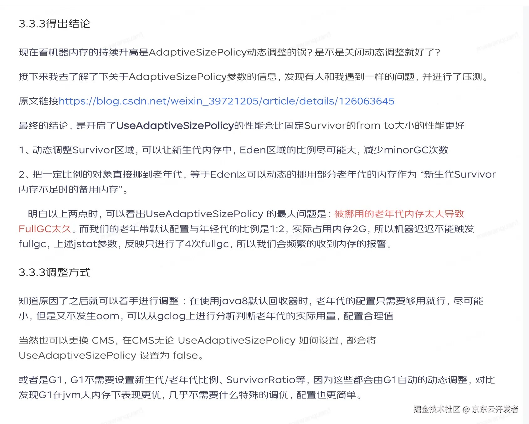 年轻代的S区设置过小: E区正常回收后存活的对象,在S区放不下直接晋升到老年代,有一个大坑就是JAVA8默认收集器Parallel Scavenge为了处理更大的吞吐量会动态调整S区,在线上运行一段时间后S区会变得很小,导致大量对象进入到老年代,我在优化实战中排查过这个问题