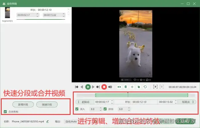 步骤5:录制结束后,可以进入 【高级剪辑】 页面对视频进行快速分段、剪辑、增加特效等操作,让您的视频内容更加丰富多彩。