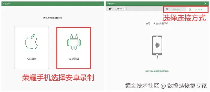 步骤3:该软件支持录制iOS系统和安卓系统的手机,在此荣耀手机选择 【安卓录制】 。在弹出的连接方式中,您可以选择 【无线连接】 或 【USB连接】 的方式进行连接。