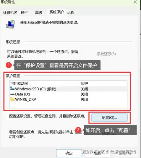 步骤2: 在“系统保护”页面,在“保护设置”上可以查看该电脑是否已开启文件保护,如显示已开启,则进行下一步操作:单击 “配置”,到新的页面,把电脑的数据状态还原到文件误删之前的时间点。