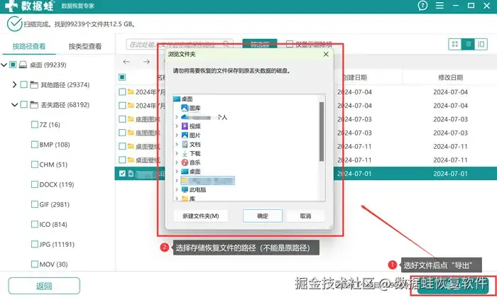 第3步: 选择目标文件后,点击“导出”。点击完后会弹出窗口,在窗口中选择恢复文件的新存储位置,最后 “确定”即可。