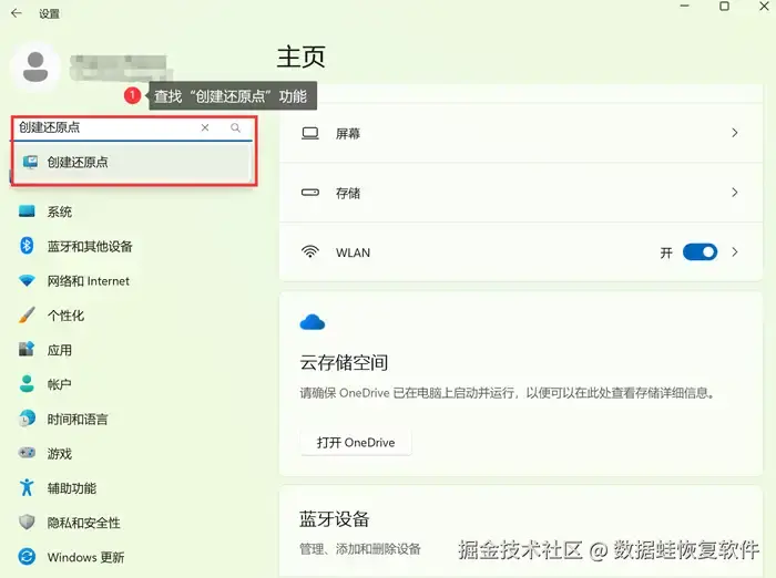 步骤1: 进入“设置”页面,搜索“创建还原点”进入“系统保护”页面(如果找不到,可以直接在设置的搜索框内查找“系统保护”等关键词)。