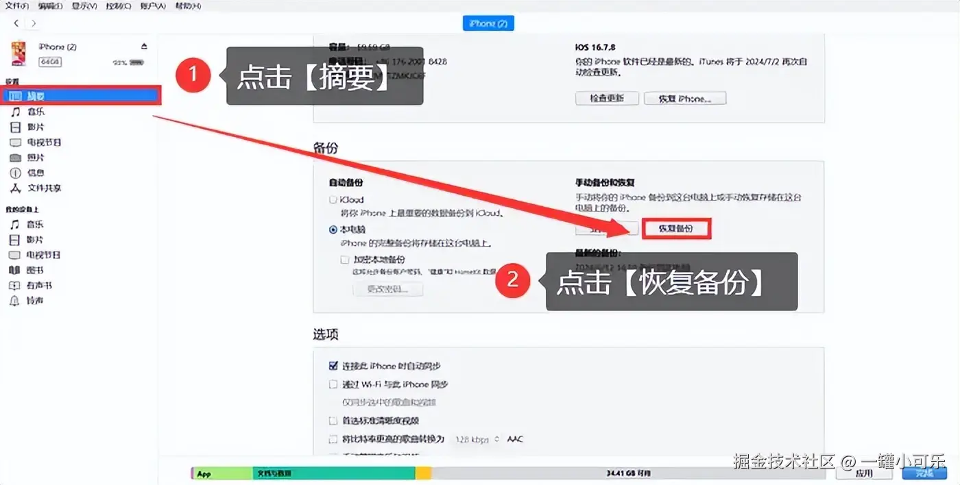 步骤1:使用数据线将你的苹果设备连接到电脑。在iTunes的顶部菜单栏中,点击设备图标。步骤2:在设备的iTunes管理页面中,点击 【摘要】 选项卡。点击 【恢复备份】 按钮。