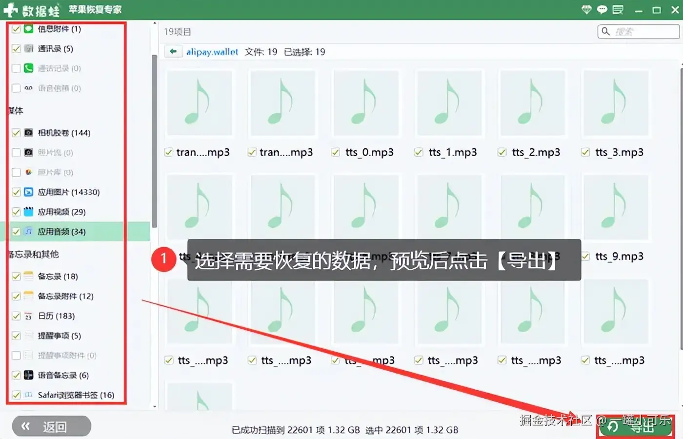 步骤3:扫描完成后,选择你需要恢复的照片、视频、通讯录、消息等,点击 【导出】 按钮。选择一个电脑上的文件夹作为恢复数据的存放位置,然后等待恢复过程完成。