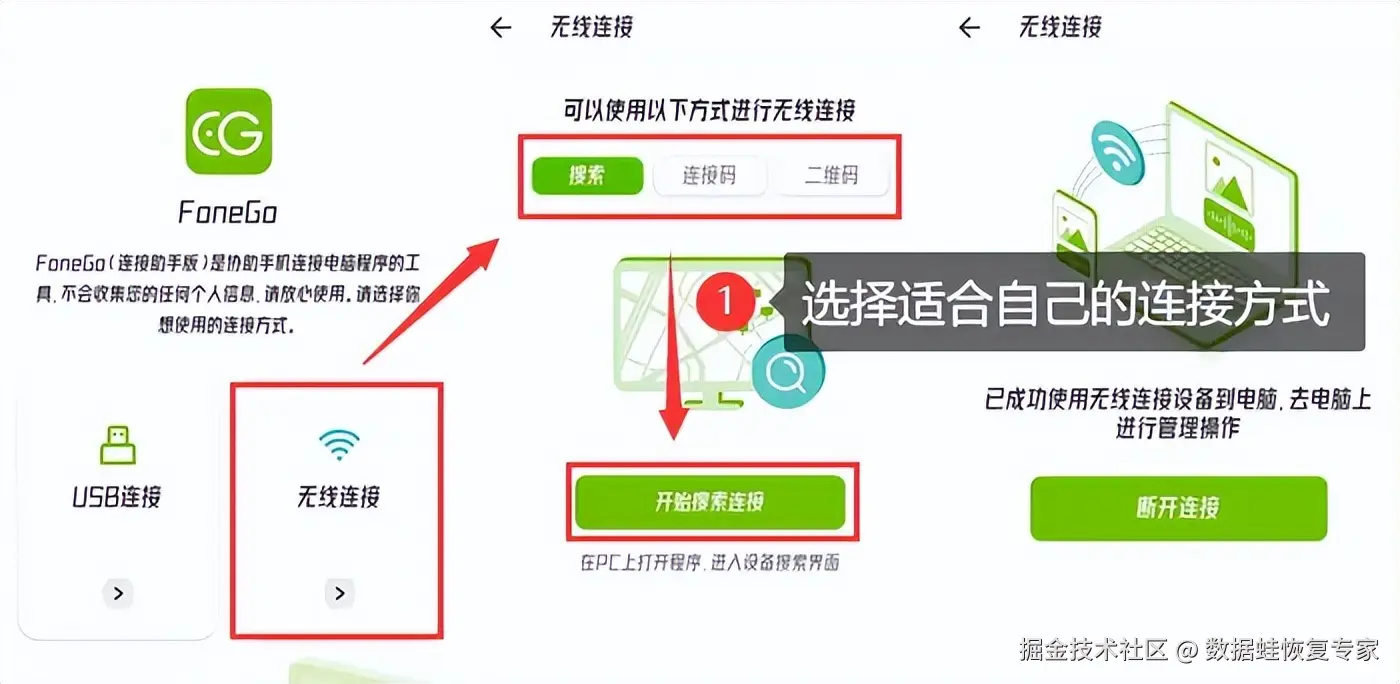 步骤1:启动软件连接设备。选择 【USB连接】 或 【无线连接】 ,然后按照步骤提示进行手机与电脑的互连。