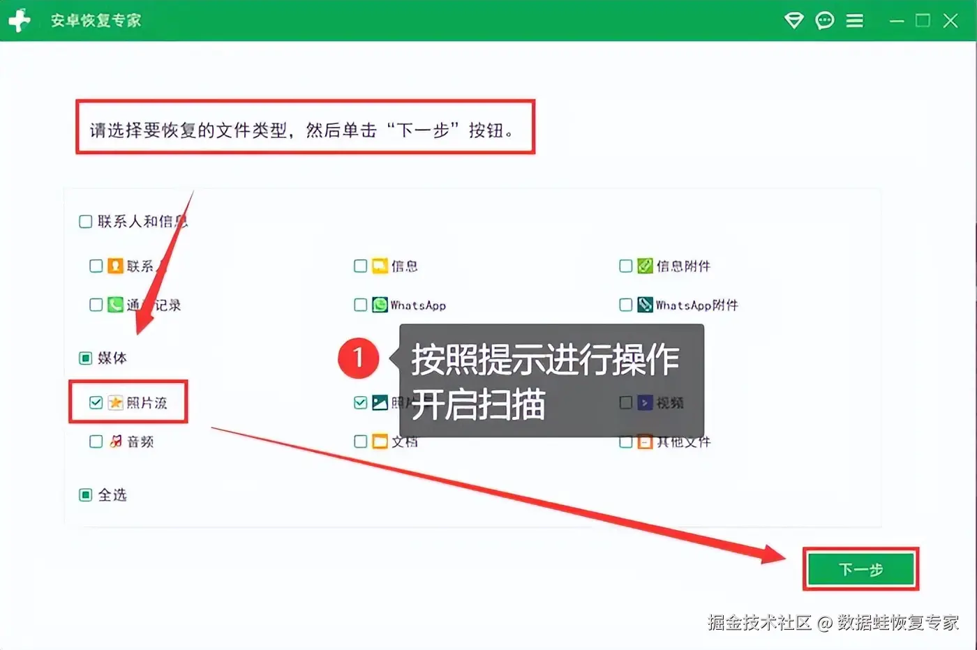 步骤2:手机被电脑识别后,我们可以在最新界面上选择恢复的类型。如点击 【照片流】-【下一步】 ,即可开启扫描。