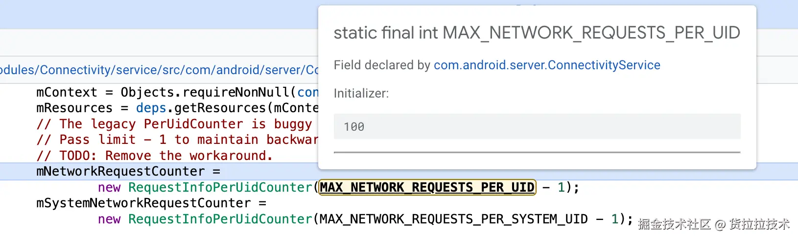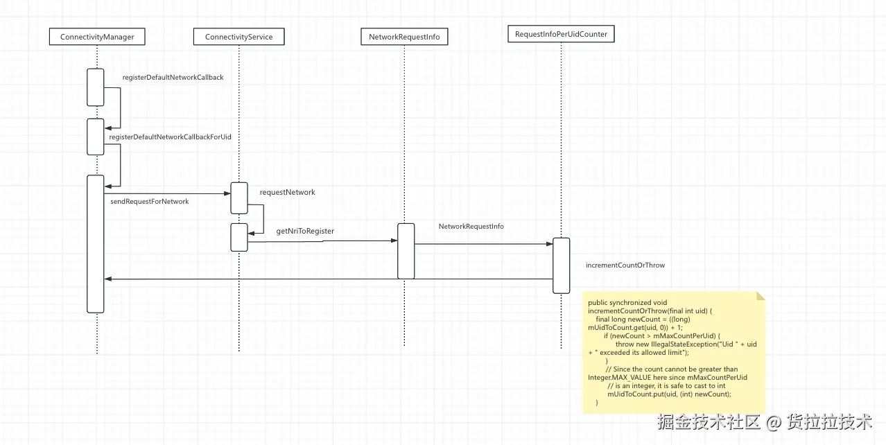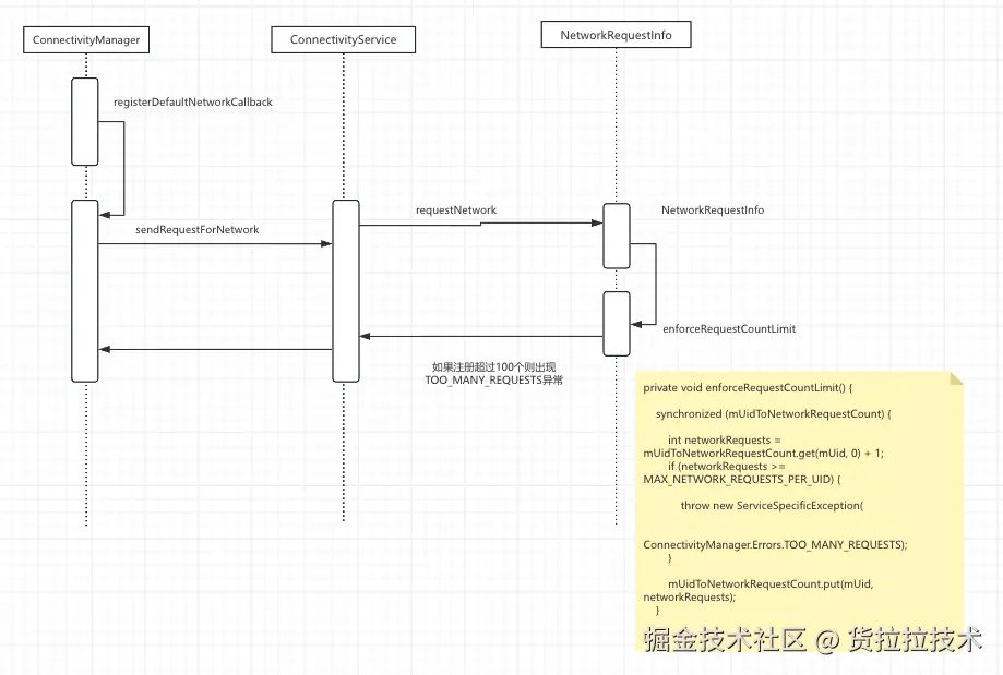 在ConnectivityService的requestNetwork中创建了一个NetworkRequestInfo对象,在NetworkRequestInfo的构造函数调用了enforceRequestCountLimit检查数量上限,如果通过uid的注册数量大于等于100,则抛出TOO_MANY_REQUESTS异常,由ConnectivityManager的sendRequestForNetwork捕获并再次抛出
