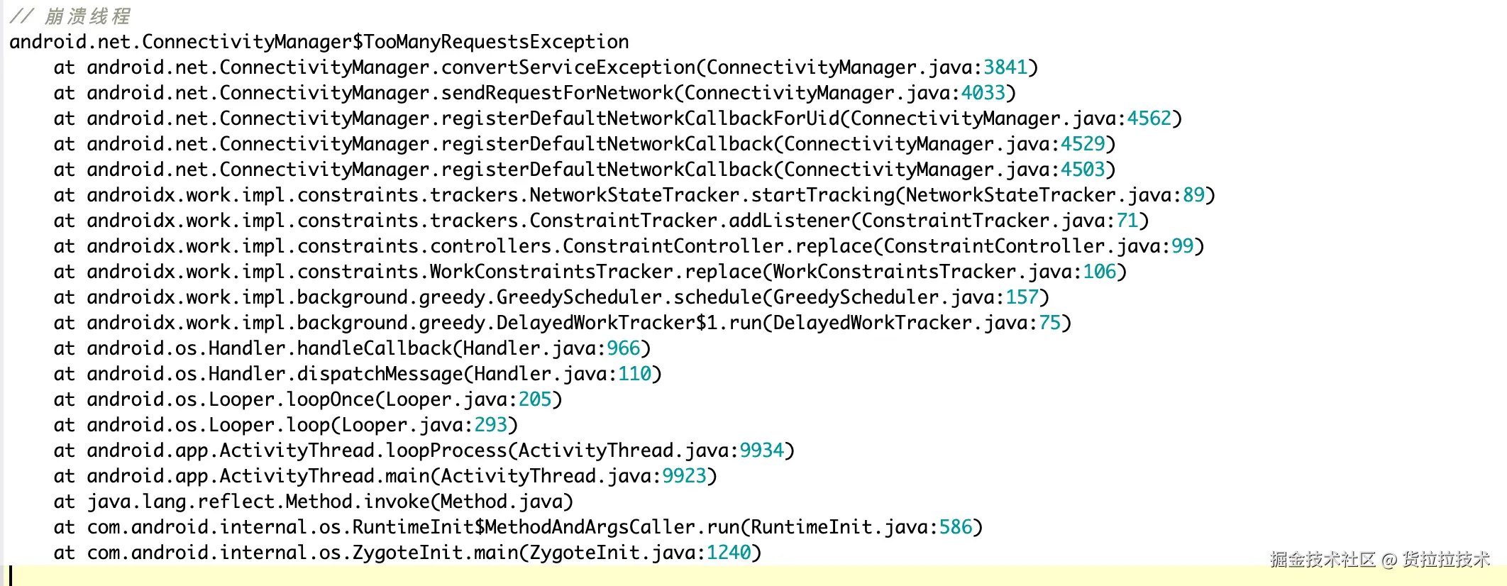1、从崩溃堆栈看,问题发生在WorkManager库里的注册网络监听的代码里。