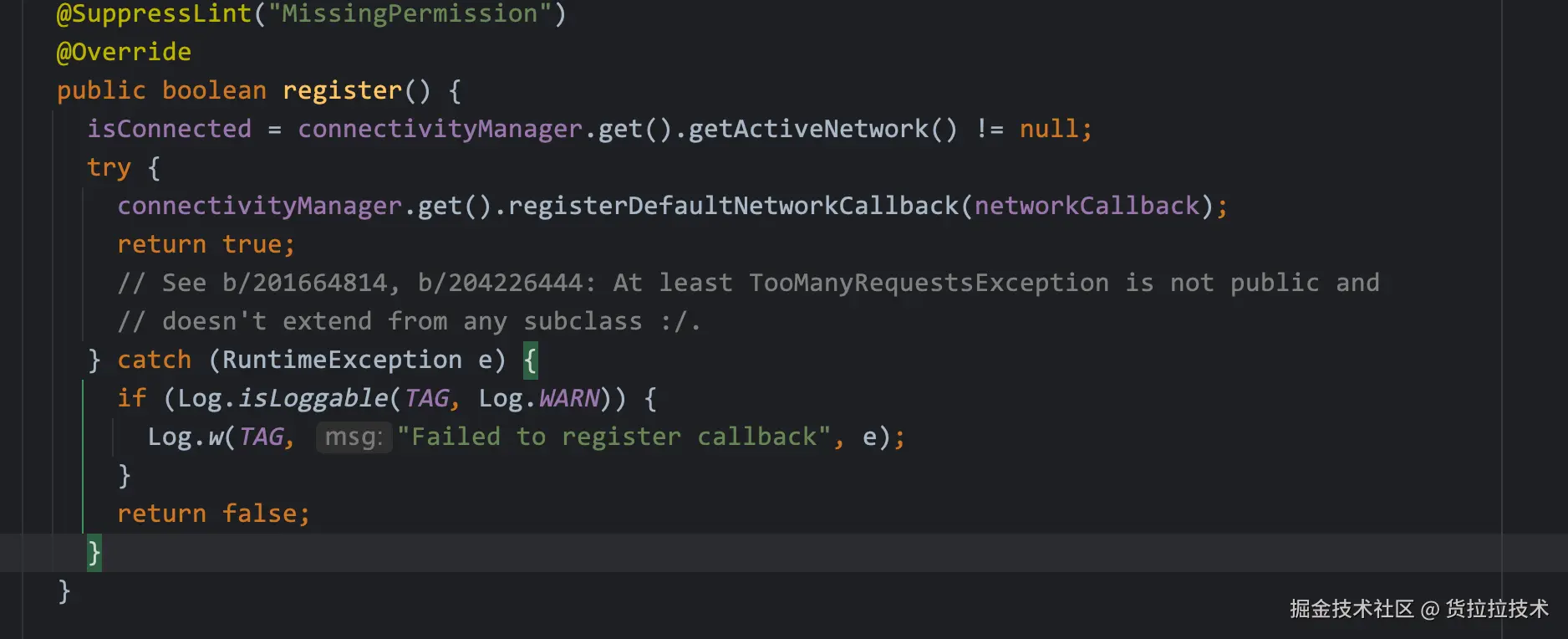 3、进一步分析了项目中使用WorkManager的地方,发现这一业务逻辑并不是最近上线的新功能,之前也从未出现过类似问题。同时,我还查看了应用中所有注册网络监听的地方,因为从堆栈信息来看,问题是由于注册了过多的网络监听,触发了系统的阈值限制。在对第三方库的分析中,我确实发现了一些注册网络监听的代码,但这些地方都已经加上了try-catch块。