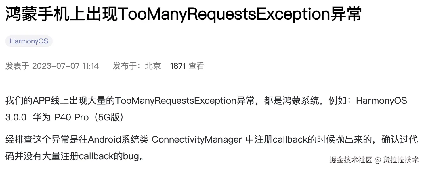 4月份开始,公司的几个Android项目线上突然出现了很多华为鸿蒙的设备TooManyRequestsException的问题,在社区上也零零散散看到一些关于华为鸿蒙设备出现TooManyRequestsException的反馈,但是都没有明确的解决方案。