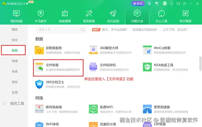 第2步: 在新页面左边选择【数据】,点击【文件恢复】。