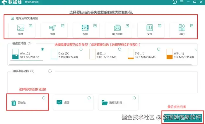 第2步: 进入主页面,页面上方选择需要恢复的文件类型,中下方选择【回收站】。选择完毕点击右下角的【扫描】。
