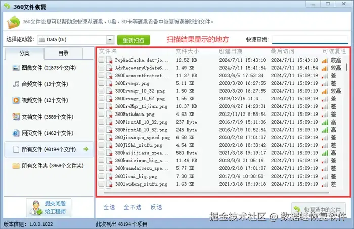 第4步: 等扫描结果出现后,360的文件修复功能能够展现出恢复文件的大小、创建日期、最后访问日期和恢复的可能性评估等详细信息。但最大缺点是文件名会乱码,用户进行部分目标文件的选择和恢复时,面对这个情况就不太方便。