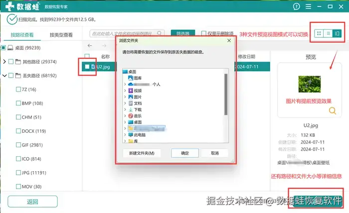 第3步: 扫描结果出来后,可以在右上角的三个小框切换文件的视图,选择最适合您目标文件的查找方式,助你更快找到目标文件。选择好文件后,点击【导出】,在新弹出的窗口上选择恢复文件的存储位置,选择完毕后点击【确定】即可。