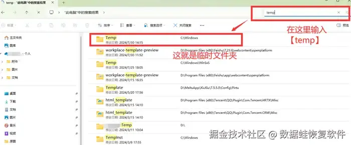 点击【此电脑】,在搜索框上搜索【temp】,打开【temp】文件夹,寻找目标文件的备份,复制回原位即可实现恢复回收站文件的目标。