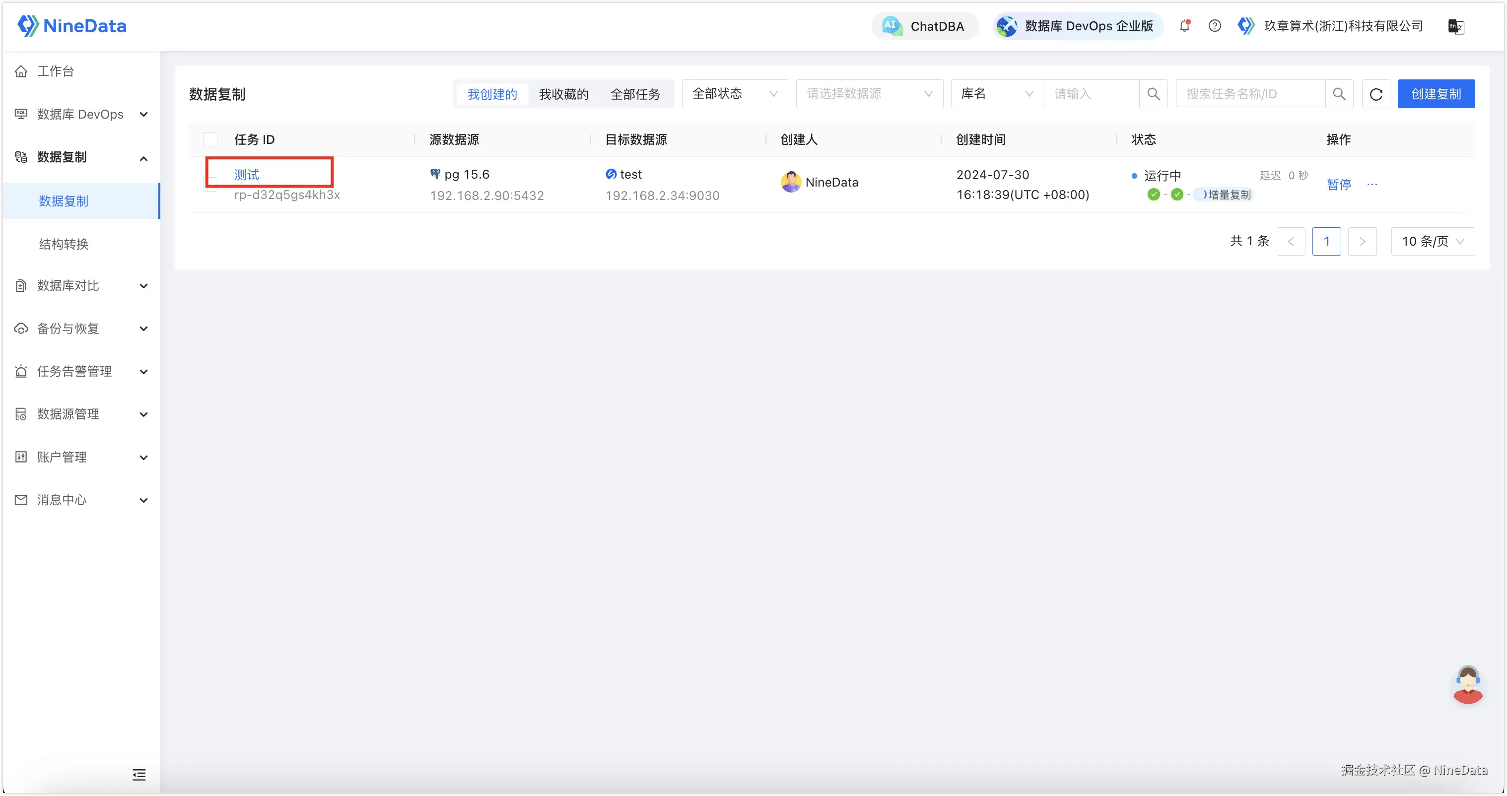 - 登录 NineData 控制台,单击数据复制>数据复制,然后单击步骤二中创建的复制任务 ID。