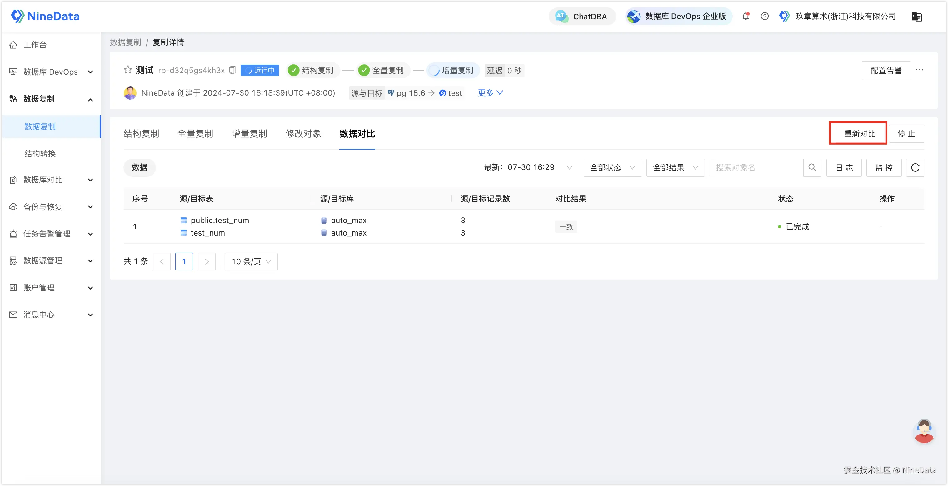 除了同步功能以外,NineData 还提供了同步后源端和目标端同步数据的对比功能,以确保目标端数据的完整性。