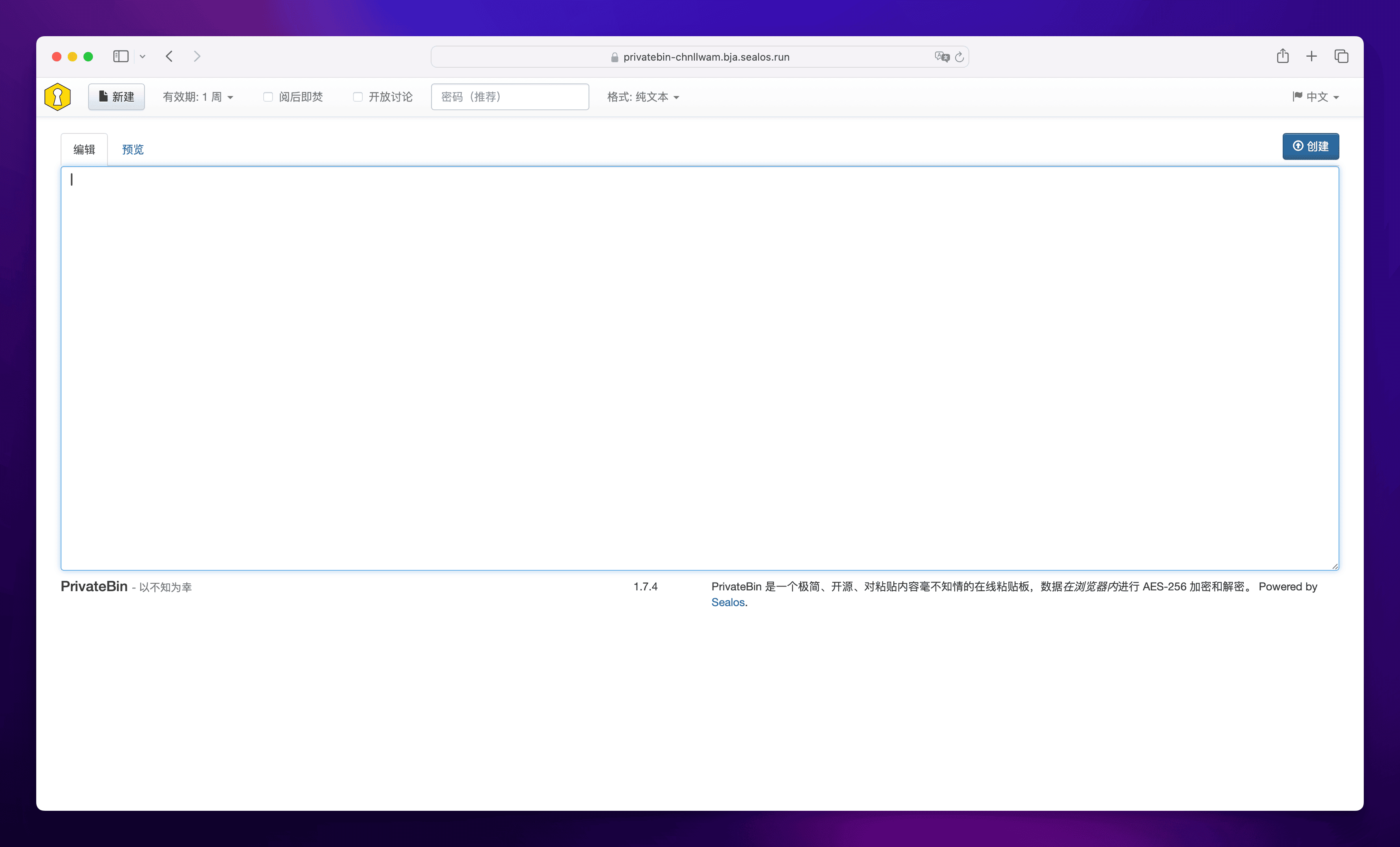 直接点击这个图标就可以打开 PrivateBin 的可视化界面了。