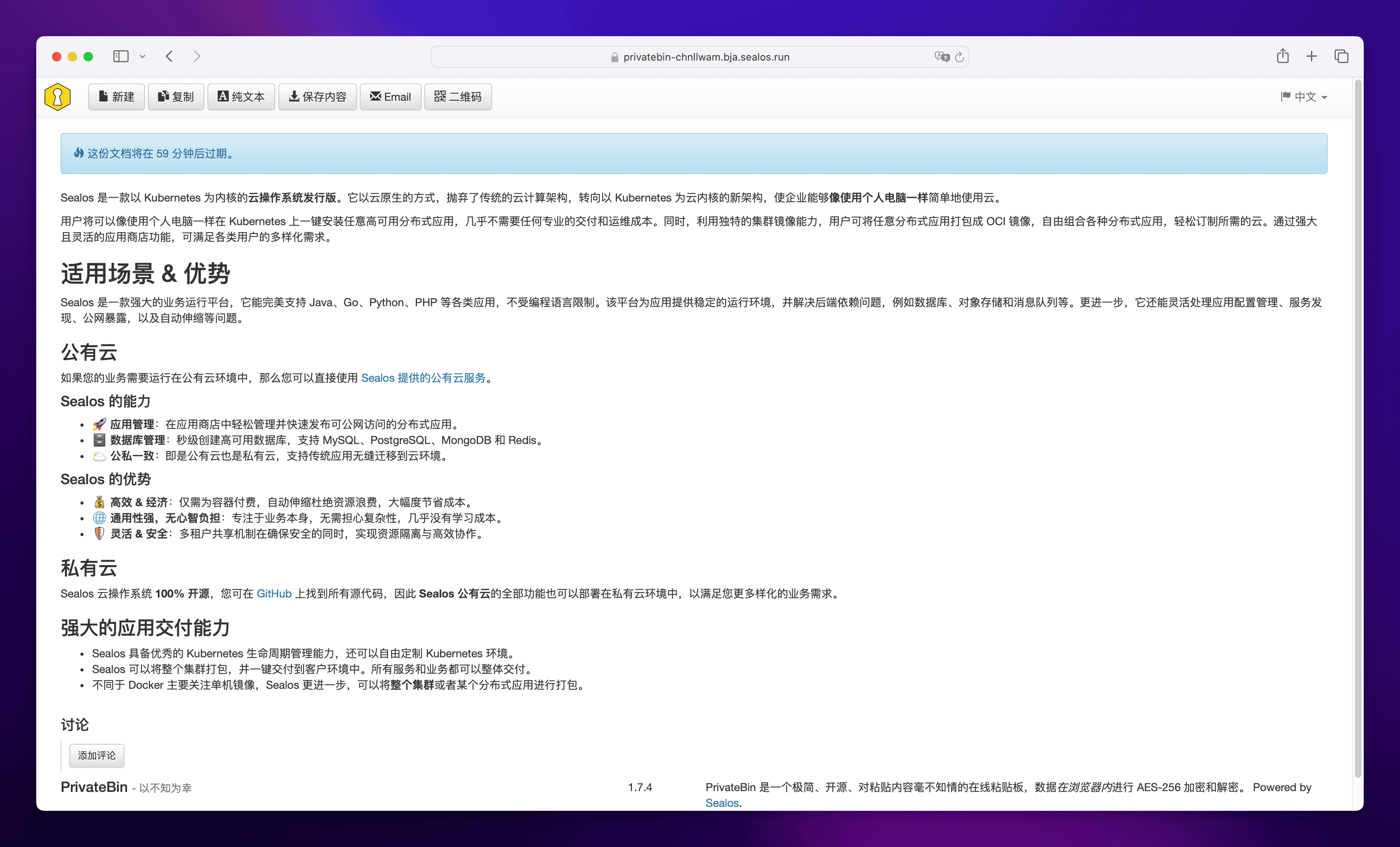 如果你想快速部署一个 PrivateBin,又不想陷入繁琐的安装和配置过程,可以试试 Sealos。