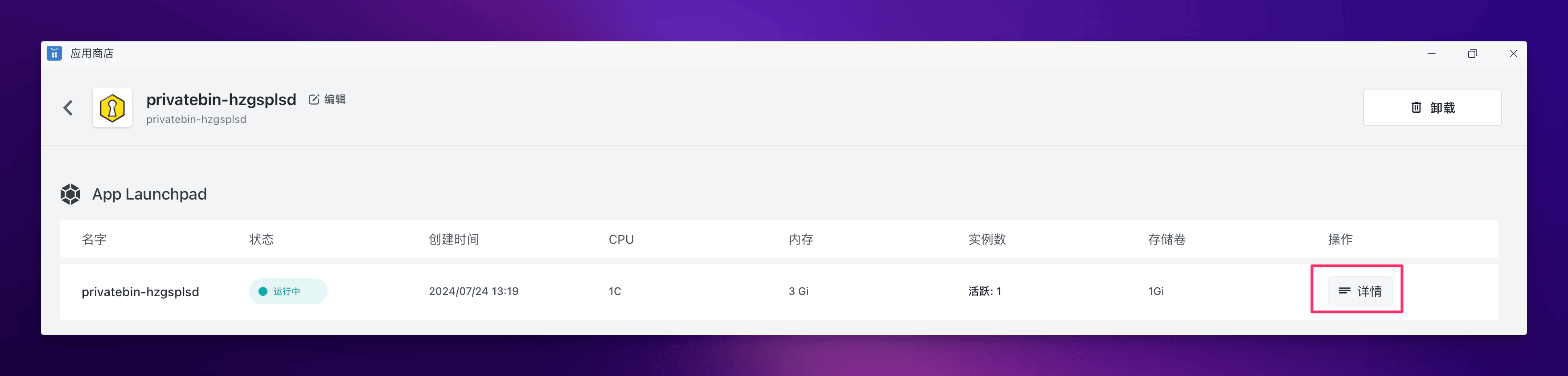 啥也不用填,直接点击右上角的 “部署应用” 开始部署。部署完成后,直接点击应用的 “详情” 进入该应用的详情页面。