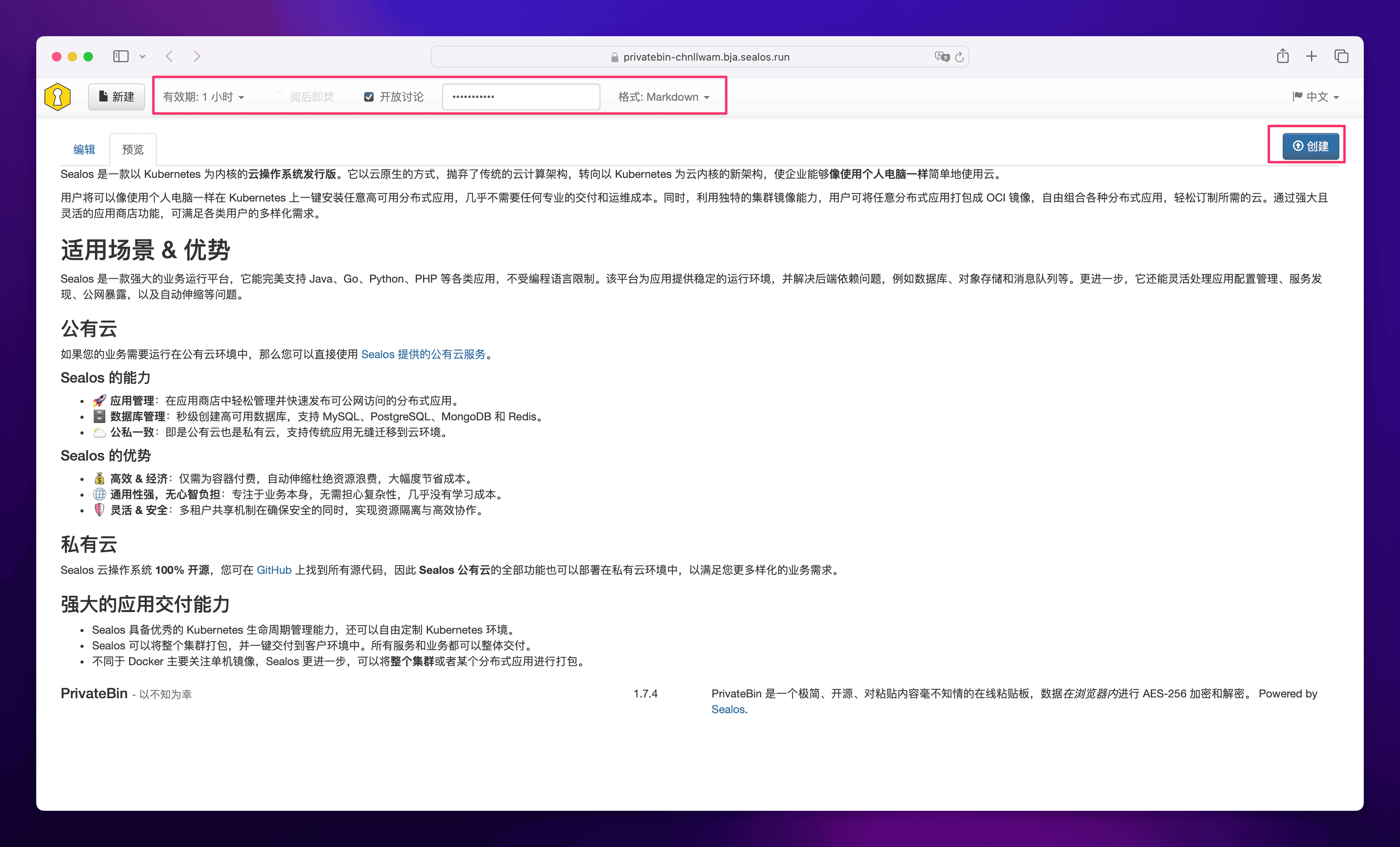 等待应用状态变成 running 之后,直接点击外网地址便可打开 PrivateBin 的可视化界面。