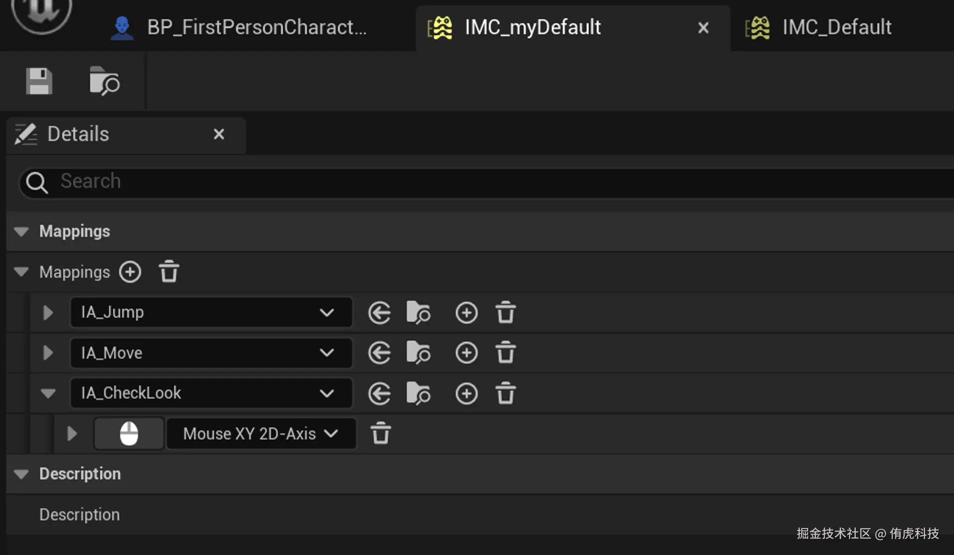 案例中为第一人称视角,鼠标的移动会控制相机的朝向(IA_Look),当测试物体旋转功能时,希望关闭该输入事件,转而使用鼠标移动来控制物体的旋转(IA_CheckLook)。这里使用了方案一,用了不同的IMC: