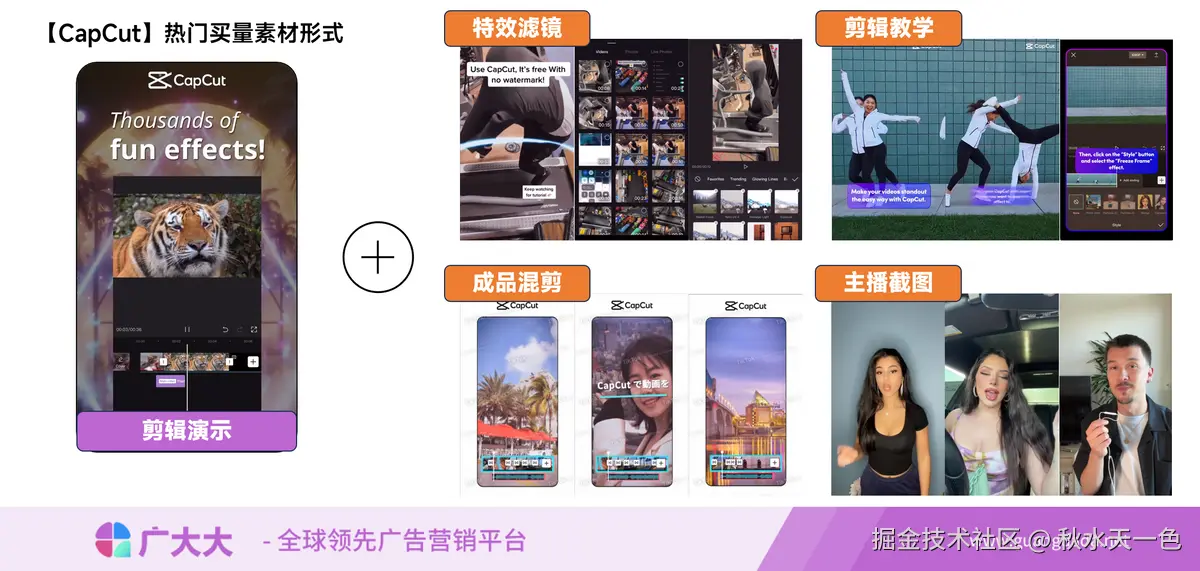 - AI特效: 剪辑类的特效视频在【TikTok】上也十分火热,尤其是在搭配推广【CapCut】上非常有效;