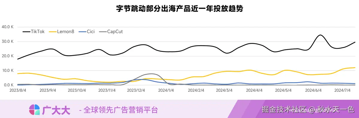 总的来说,字节跳动这几款主推产品在2024年除了个别产品会因为具体时段或热点事件来增减投放量,其余时段都算是比较平稳的,投放量最大的依然是【TikTok】,但其在较为冷门赛道的动作也不容忽视,有时候量少反而代表着更加高质。