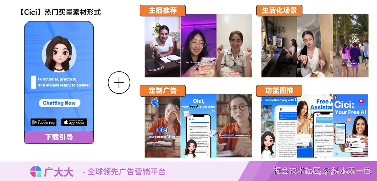 - 定制广告: 这一类素材和我们日常看到的广告则比较类似,主要结合的是学习场景,来体现【Cici】在教育方面的潜力;