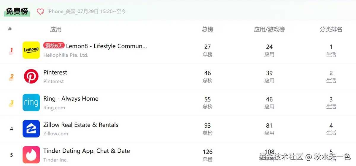 在图文社交方面,字节跳动则祭出了【Lemon8】这一大杀器,早期日本起势,中期深耕东南亚,而现在也在欧美地区崭露头角——【Lemon8】在美国App Store生活分区免费榜已经开启霸榜模式,已经成功登顶冠军多时了。