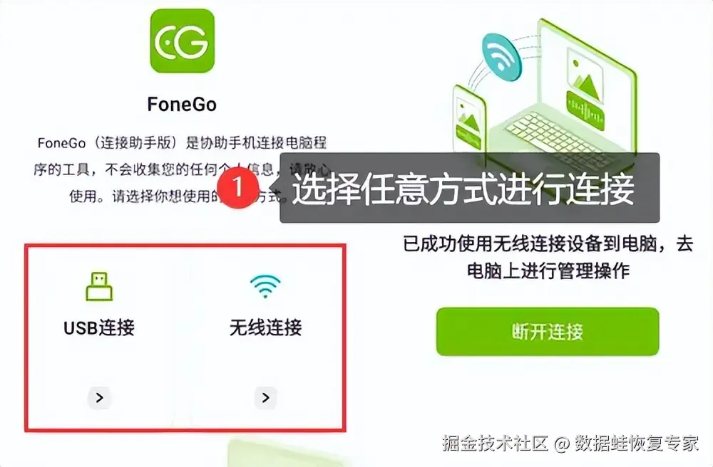 步骤1:在电脑安装并打开软件,然后按照提示,在手机上安装相应的程序,供设备连接。