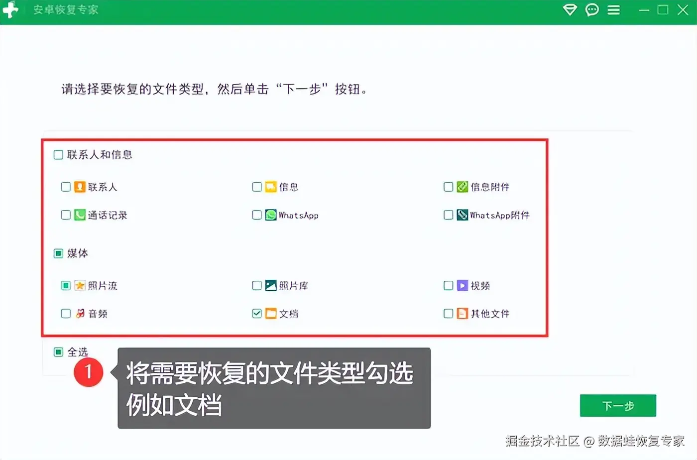 步骤2:连接稳定后,选择需要扫描的存储数据,然后点击 【下一步】 ,发起扫描指令。