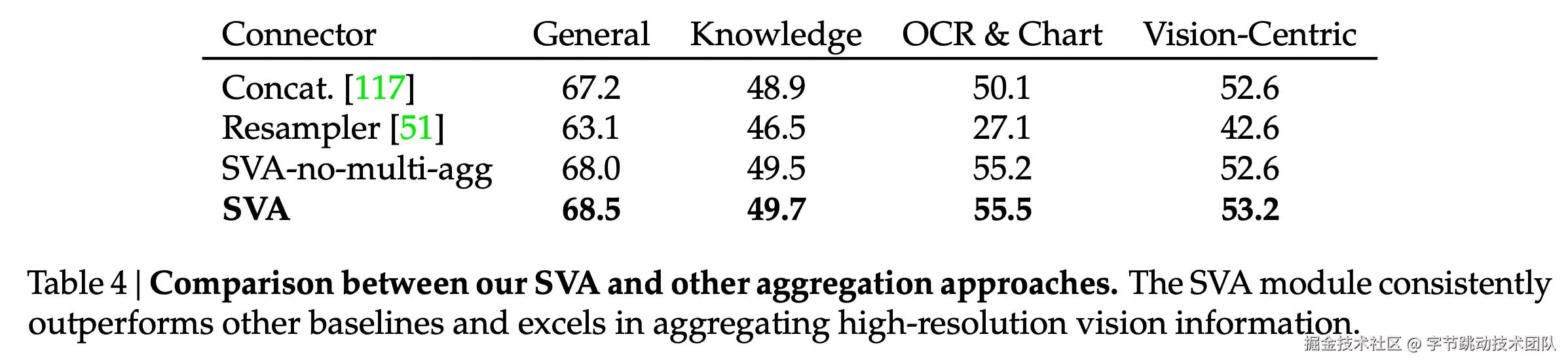 - 模型侧:4个visual encoders通过SVA聚合;