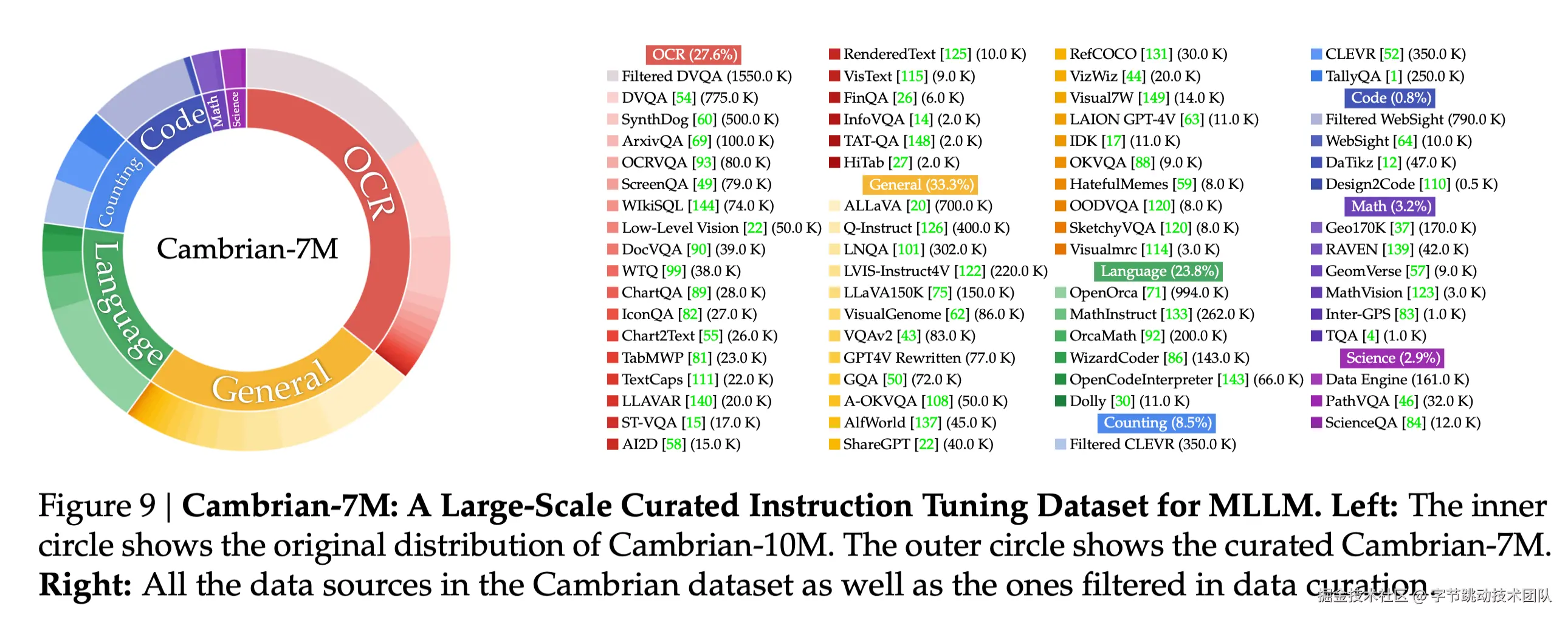 - 如图9所示,paper收集了非常多的多模态数据,包括OCR数据、VL数据、纯文本数据等;除了以上7M的开源数据,作者还从Internet定向增补了3M的数据,主要手段是用搜索引擎+wiki+大模型生成prompt;这里所有的数据加起来产出了Cambrain-10M数据集;